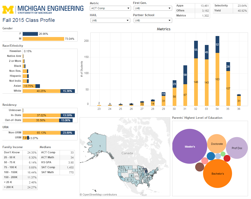 Once again, the entering class of Michigan Engineering students is exceptional. The following numbers describe only part of the picture; through a holistic review, we also consider qualitative characteristics that complete each student’s “story.” If you have questions, please contact Jeanne Murabito (murabito@umich.edu).